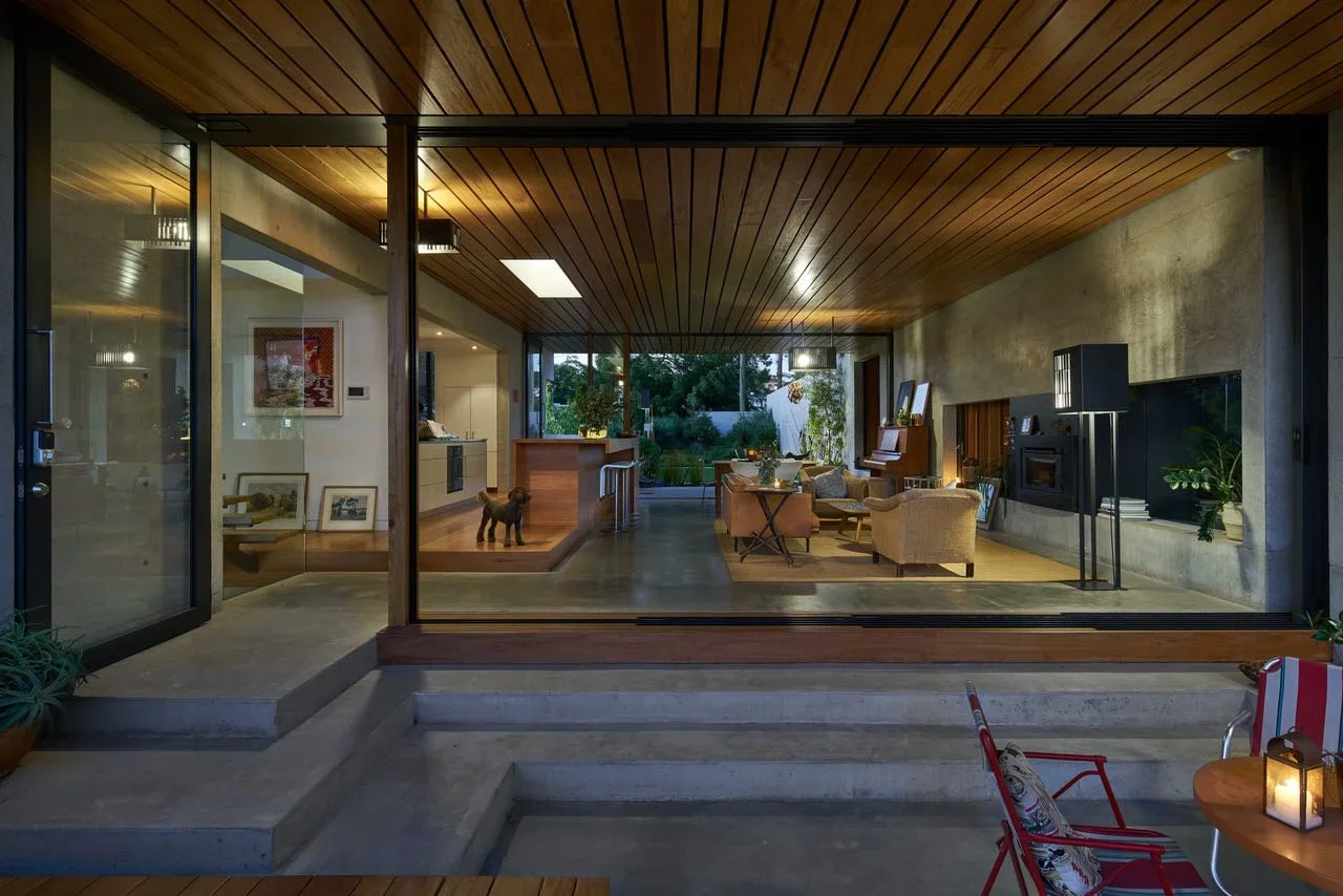 The principal idea for the house was to leverage an existing and rare 80 year old riverbank landscape as well as unencumbered northern views and make it their primary lived experience. A continuous ribbon concrete wall carves out a more private territory to these two extraordinary landscapes and enables and seamlessly negotiates both external and interior spaces to blur the boundaries that straddle their living space.