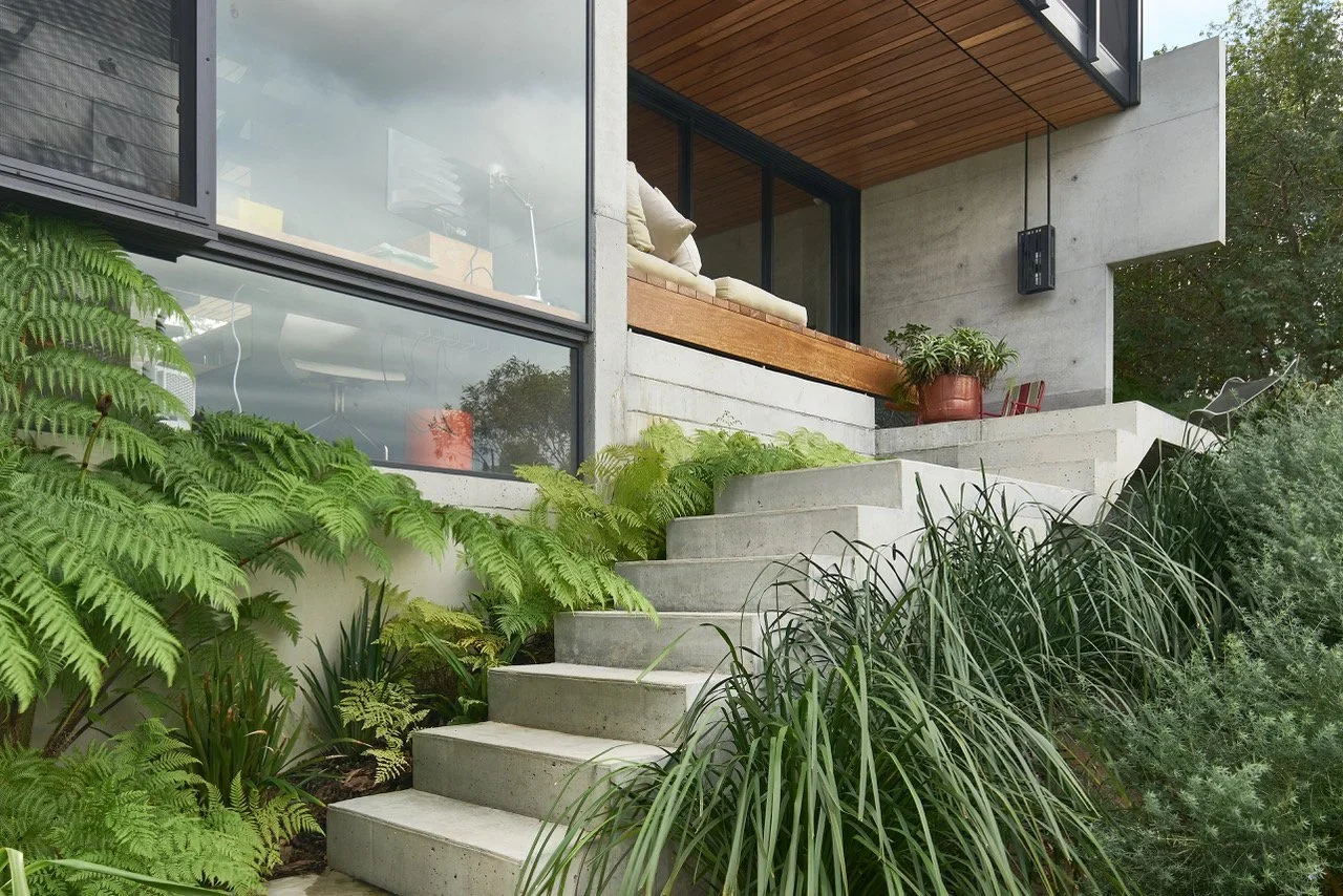 There were two critical trades in the making of this building: (1) Fine concrete work which was required to frame, enclose and define landscape and interior spaces; (2) Carpentry that required a passion for working timber for screens, joinery and ceilings. In both instances the contractor gave the time and space for the trades to excel. The landscape being the primary reference point for the house explored two ideas. The stairs and walls that enabled the original access to the waters edge. The northern landscape explored a contained courtyard landscape and the wild beyond the garden walls.