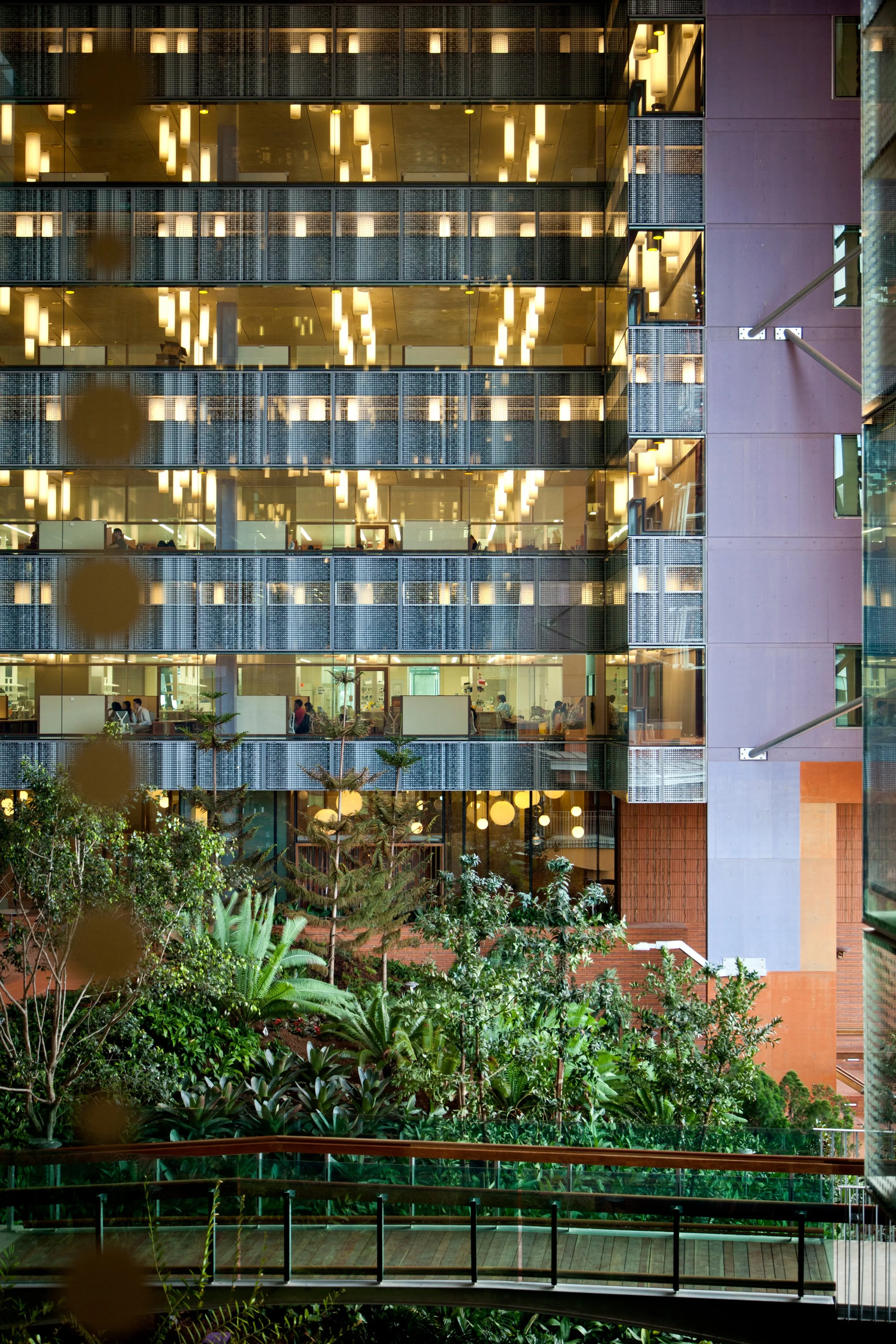 Spacious laboratory and write-up areas connected with light and views to other research spaces, hug the edge of the outdoor room with views back to the city. Shared circulation occurs along an arcade with amazingly transparent cross views. Write-up spaces connect to the laboratories with floor to ceiling glass maintaining views out of both workspaces at all times, including critical visual links to the courtyard arcade and social spaces.